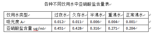 国家饮用水亚硝酸盐的标准含量是低于1ug/ml,由实验数据可知几种饮用水中的亚硝酸盐含量均符合正常健康的饮水标准。但同时也表明过夜水和久存水的亚硝酸含量远高于正常沸水。